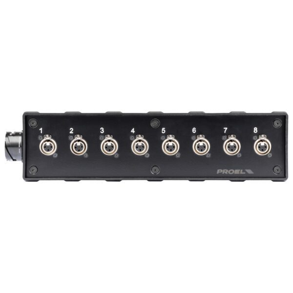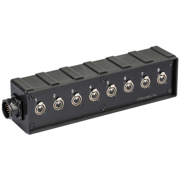 Audio box in materiale plastico antiurto cablato con 8 prese pannello XLR 3P NEUTRIK e connettore multipolare di collegamento 25 Poli (CMIL25MP).