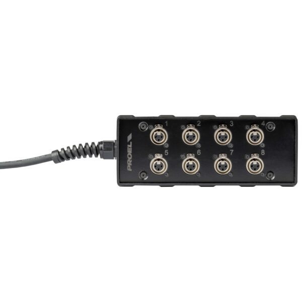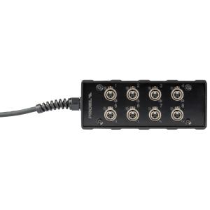 Audio box in materiale plastico antiurto cablato con 8 prese pannello XLR 3P NEUTRIK e cavo audio multipolare 10 m con guainain PVC coppie bilanciate a masse separate terminato con frusta 8 connettori XLR 3P NEUTRIK maschio volanti numerati 1 – 8.