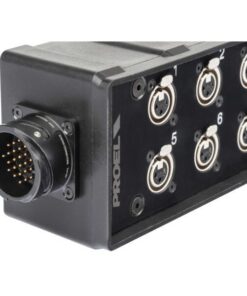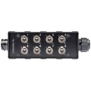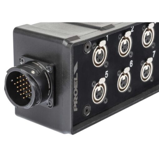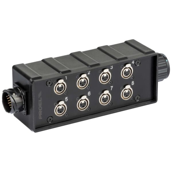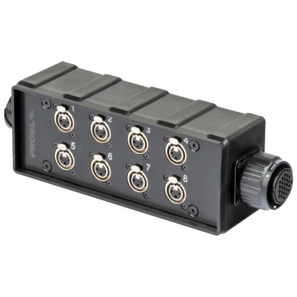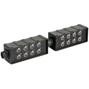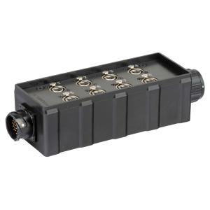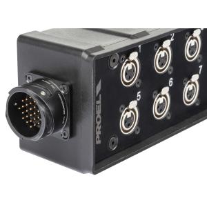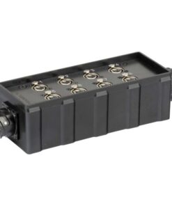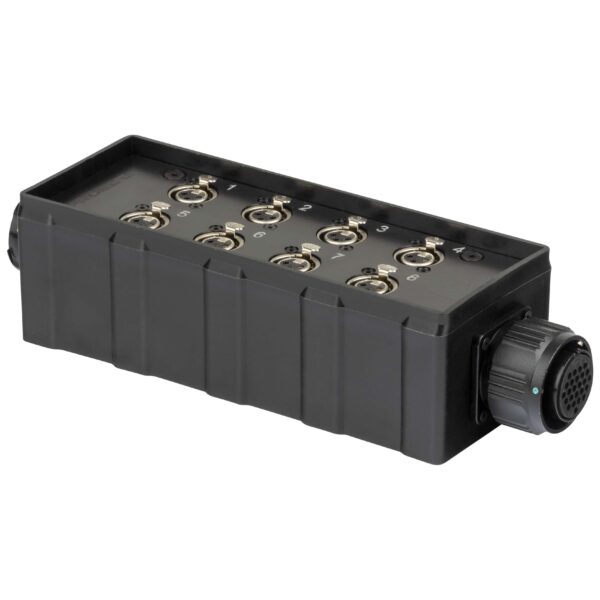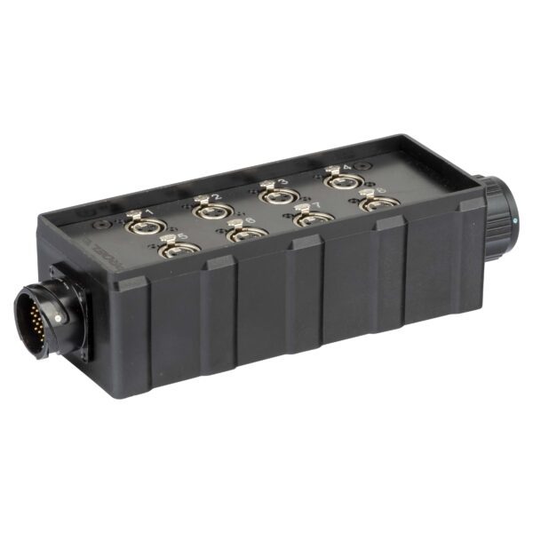 Audio box in materiale plastico antiurto cablato con 8 prese pannello XLR 3P NEUTRIK e connettore multipolare di collegamento 25 Poli (CMIL25MP) + connettore link 25 Poli (CMIL25FP).