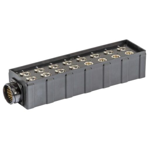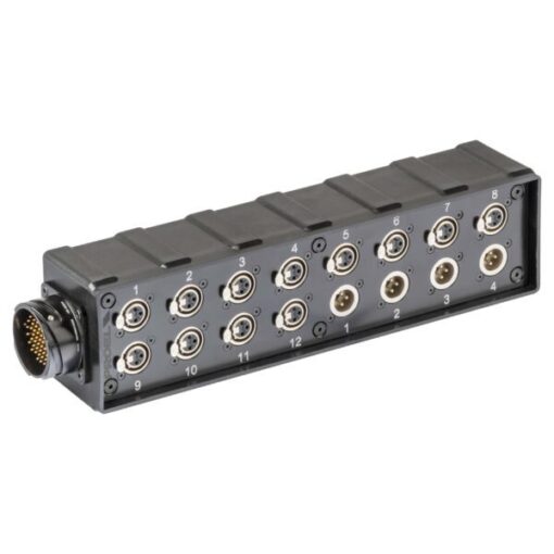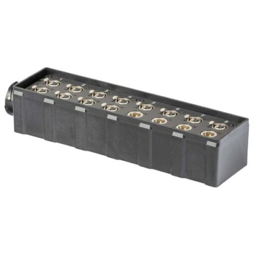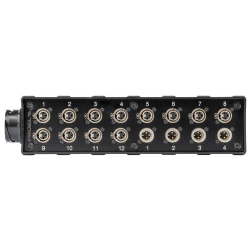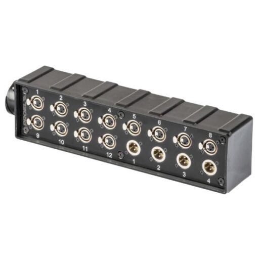 Stage box audio in materiale plastico antiurto con 12 prese pannello XLR 3P + 4 spine pannello XLR 3P e connettore multipolare maschio pannello CMIL54MP.