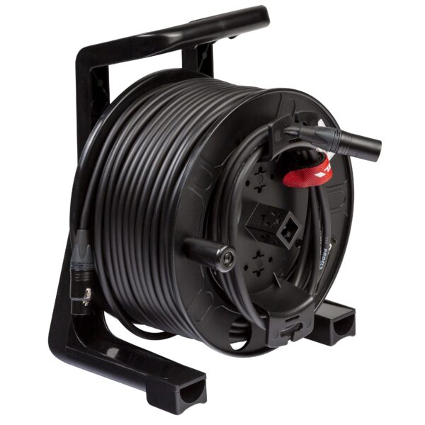 Avvolgitore professionale PROEL, con cavo DMXD – 2 x 0,22 mm² – assemblato con connettori NEUTRIK femminavolante NC3FXXBAG + maschio volante NC3MXXBAG. Lunghezza cavo 50 metri (avvolgitore AV185). Colore disponibile nero.