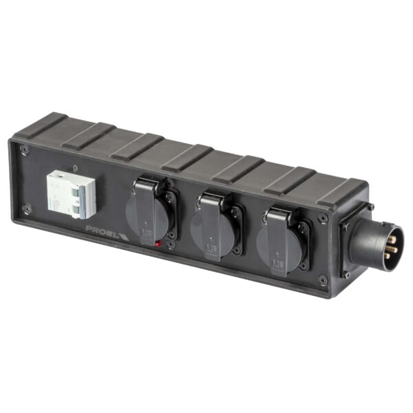 Box di distribuzione elettrica a 3 canali con ingresso spina CEE 16A – 2P+T – IP44 – 230V / uscita: 3 x presa Schuko bivalente 16A German / 10A IT 16A – 2P+T – IP54 – 230V – con interruttore magnetotermico generale 2P (1P+N)230V 4,5 KA.