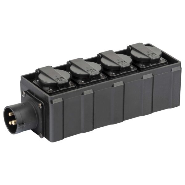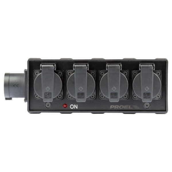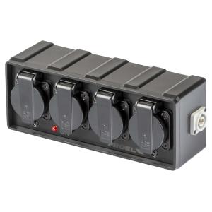 Box di distribuzione elettrica a 4 canali con ingresso spina CEE 16A – 2P+T – IP44 – 230V / uscita 4 x presa Schuko bivalente 16A German / 10A IT 16A – 2P+T – IP54 – 230V. Carico massimo applicabile 16A.