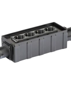 Box di distribuzione elettrica a 4 canali con ingresso spina CEE 16A – 2P+T – IP44 – 230V / uscita 4 x presa Schuko +bivalente UNEL 16A – 2P+T – 230V e rilancio su presa CEE 16A – 2P+T – IP44 – 230V. Carico massimo applicabile 16A.