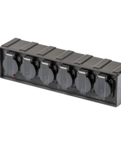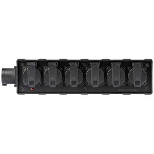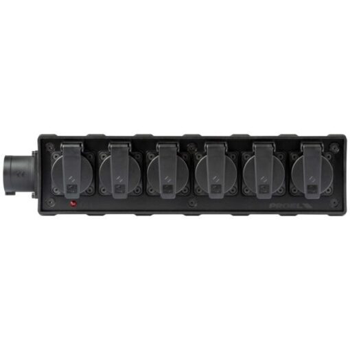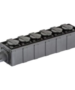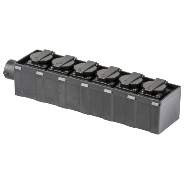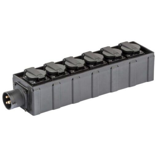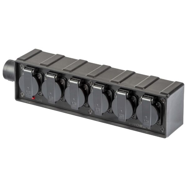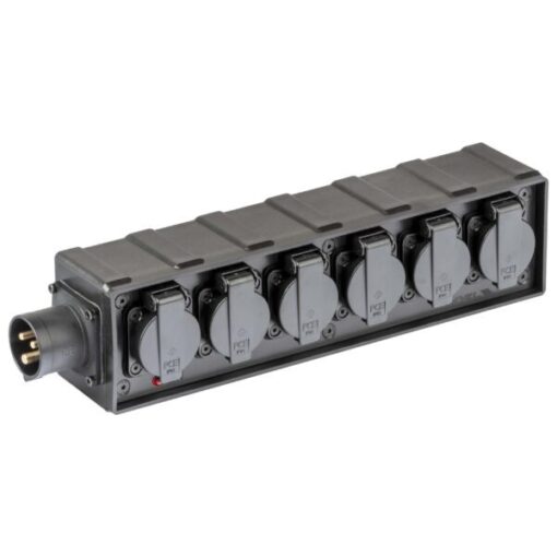Box di distribuzione elettrica a 6 canali con ingresso spina CEE 16A – 2P+T – IP44 – 230V / uscita 6 x presa Schukobivalente 16A German / 10A IT 16A – 2P+T – IP54 – 230V. Carico massimo applicabile 16A.