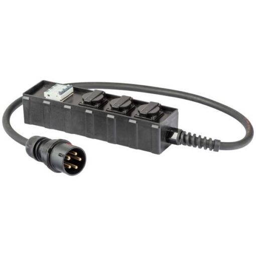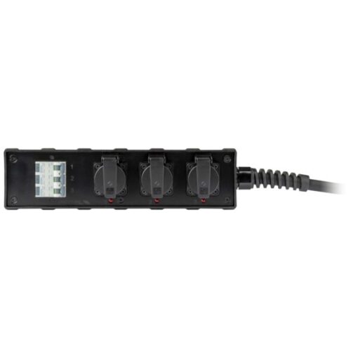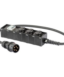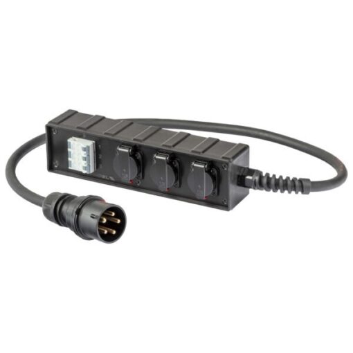 Box di distribuzione elettrica con ingresso spina CEE 32A – 3P+N+T – IP44 – 400V con cavo neoprene 5G4 mm²1,5 m / uscite: 3 x presa Schuko bivalente 16A German / 10A IT 16A – 2P+T – IP54 – 230V con 3 x interruttore magnetotermico differenziale 16A 230V 2P (1P+N) Ian 0,03 4,5 KA.