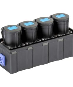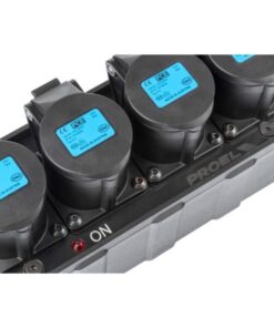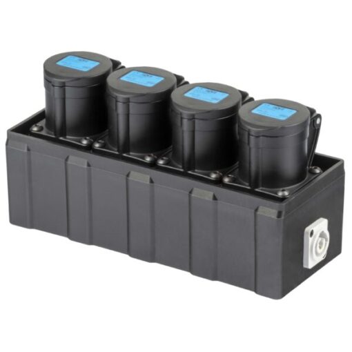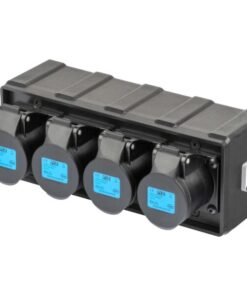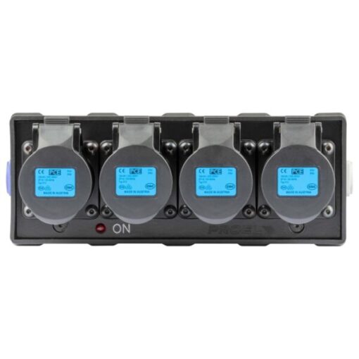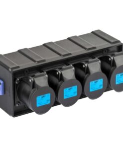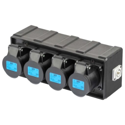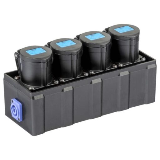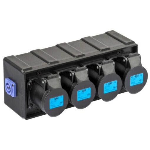 Box di distribuzione elettrica a 4 canali con ingresso spina powerCON NAC3MPXXA POWER IN 20A 250V – con4xpresa CEE 16A – 2P+T – IP44 – 230V e rilancio su spina powerCON NAC3MPXXB POWER OUT 20A 250V. Carico massimo applicabile 16A.