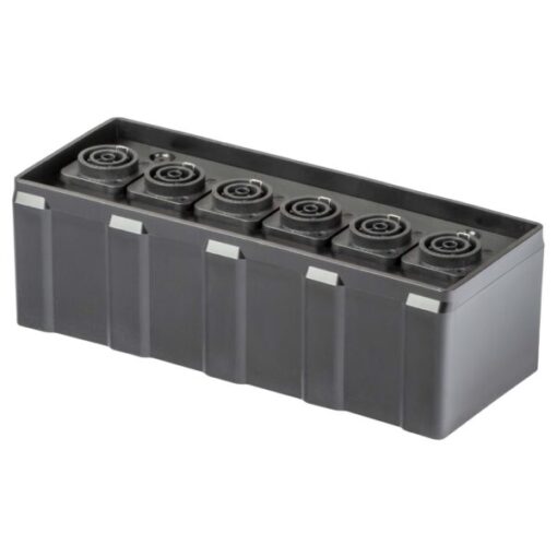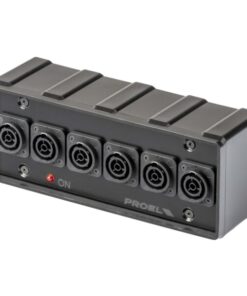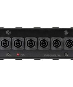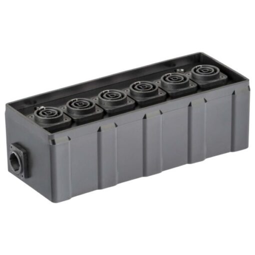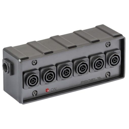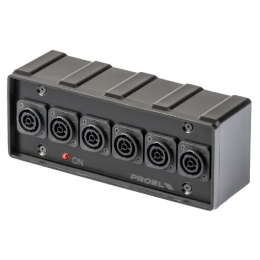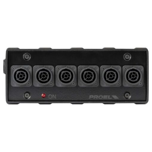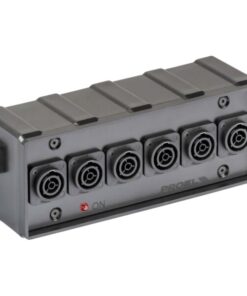 Box di distribuzione elettrica a 6 canali con ingresso spina powerCON TRUE1 NAC3MPXTOP 16A 250V / uscita 6 x presa powerCON TRUE1 NAC3FPXTOP 16A 250V. Carico massimo applicabile 16A.