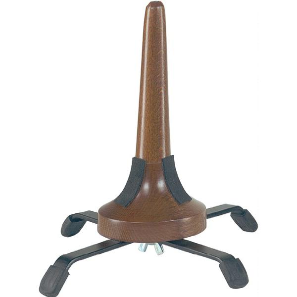 Supporto in legno lucido per tromba con feltri di protezione strumento.