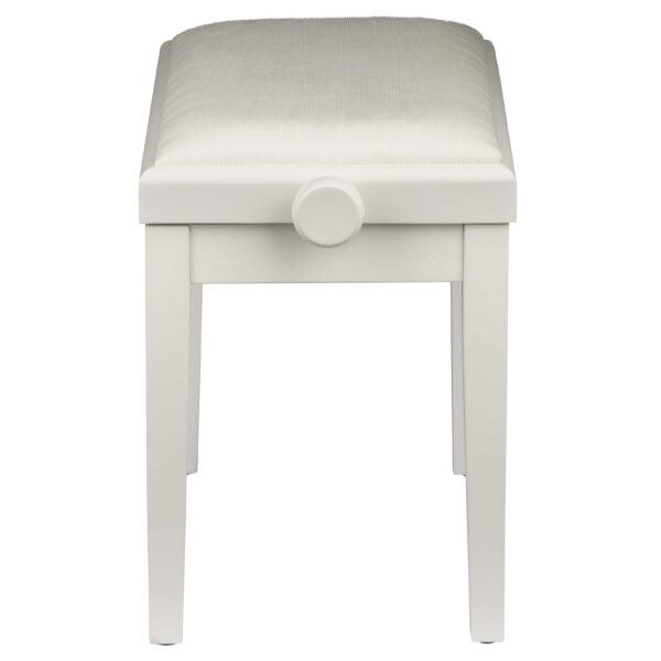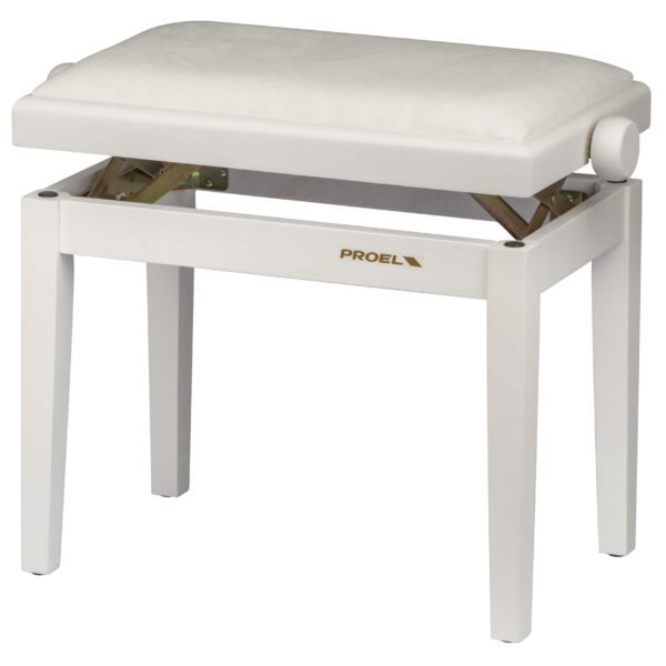 Panca professionale regolabile in legno per piano ed organo. Telaio Bianco opaco. Cuscino imbottito con rivestimento in velluto bianco.