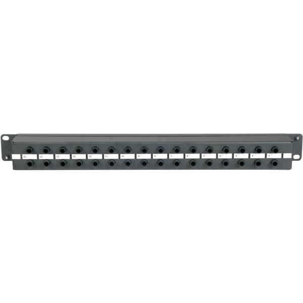 Patchbay dal nuovo design ad accesso frontale, 1 unità rack 19′, 32 canali invertibili a 180° senza saldature o cambiamenti di circuito direttamente dal frontale asportabile.