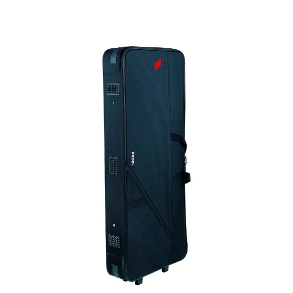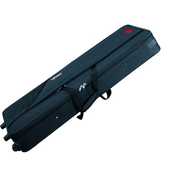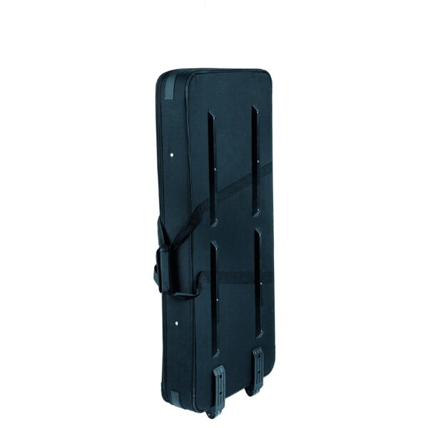 Custodie per tastiera realizzate in Nylon 600D con telaio in PVC rinforzato e imbottitura in soft foam da 20mm; rivestimento interno in morbido tessuto a protezione dello strumento. Dotate di divisori interni mobili con strap in Velcro per adattare le dimensioni interne dello strumento e per assicurarne la stabilità durante il trasporto. Pratica e grande tasca esterna per accessori e cavi, maniglie imbottite in tessuto rinforzato e resistenti chiusure con zip in pressofusione. Sistema di trasporto tipo trolley con resistenti ruote in Nylon da 40mm, barre di appoggio e robusta maniglia ad incasso in metallo con ritorno a molla.