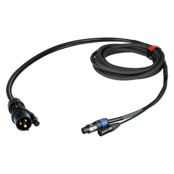 Cavo professionale Phono-Rete per il collegamento di diffusori acustici attivi. Cavo 3 X 2,5 + 2 x 0,35 – con connessioni presa volante XLR 3P Neutrik + spina CEE 16A – 2P+T – IP44 – 230V~ – h6 (DIN VDE 0623, EN 60309-2) – spina volante XLR 3P Neutrik + presa volante “POWERCON” 20A power-in Neutrik. Lunghezza: 10 m. Colore disponibile: Nero.