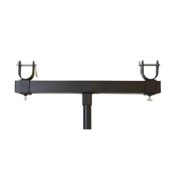Staffa professionale in acciaio zincato e verniciata di colore nero, larghezza 435 mm, dotatadi due accoppiatori con pin di sicurezza, regolabili in larghezza , per l’utilizzo con truss quadratee triangolari. Interasse regolabile da mm 150 a mm 400. Provvista di tubo inferiorecon Ø 38 mm per essere utilizzata sugli elevatori PLWIN650.