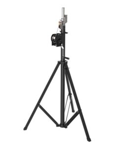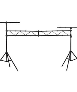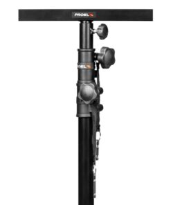 Supporto professionale per sistemi luce. Realizzato in acciaio con snodi di regolazione in nylon con fibra di vetro e connessione dei gambi in acciaio, Dotato di pin di sicurezza in acciaio. Il supporto prevede due sezioni estensibili, per un’altezza massima di 3,20 metri ed è inoltre provvisto di barra a “T”, con spigot Ø 23 mm e con set di viti per il fissaggio delle apparecchiature.
