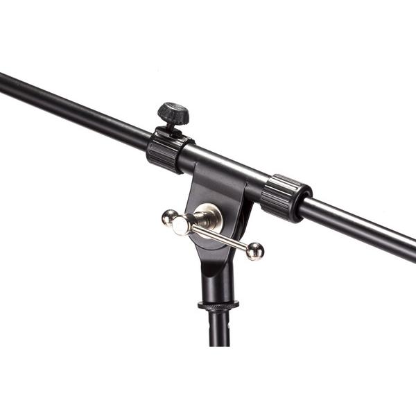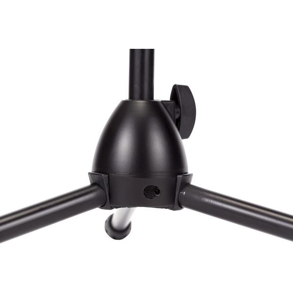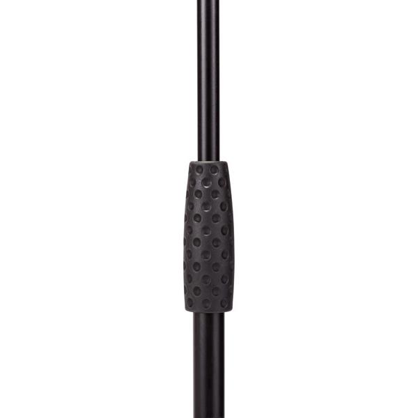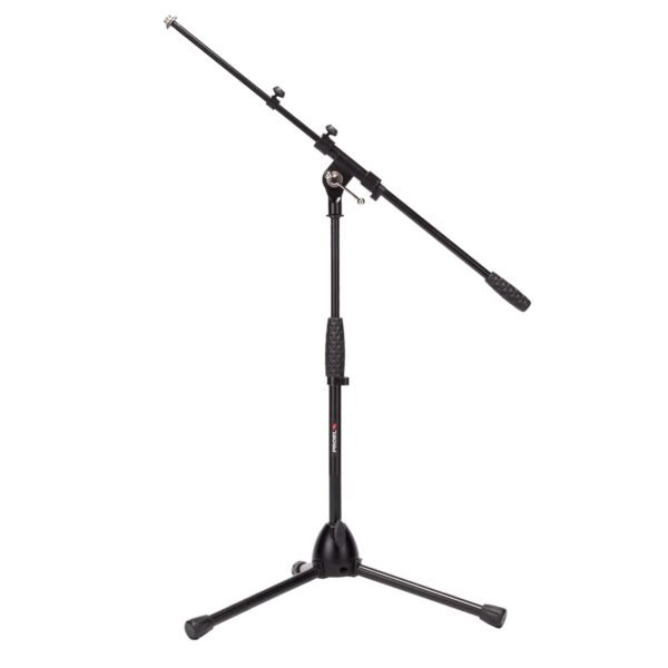 Asta professionale “nana”, con giraffa telescopica per microfono. Dotata di base tripoide realizzata in alluminio pressofuso ad elevata stabilità, corredata di snodi in nylon per il movimento dei gambi. Snodo superiore di regolazione completamente in acciaio con raccordo in alluminio pressofuso. Manicotto per la regolazione dell’altezza e contrappeso realizzati in gomma “soft grip”. Disponibile nella finitura nero opaco antigraffio.