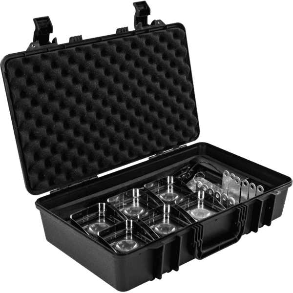 Kit composto da 6 proiettori DOTQMR, caricatore, telecomando IR, pelican case