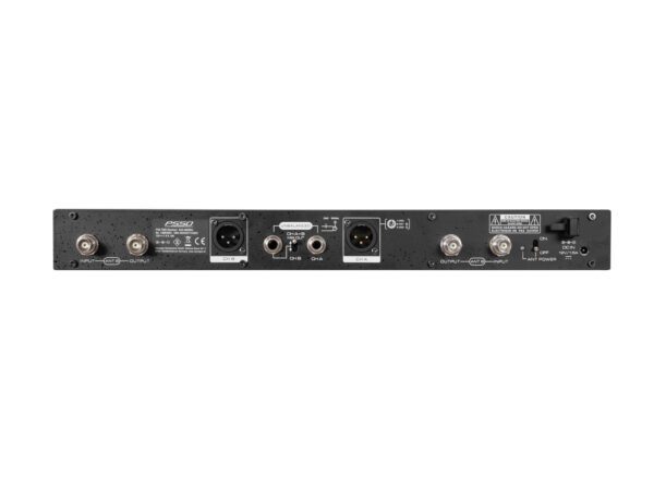 | Connections: | Input: antenna via 2 x BNC (F) 11.54 V Output: antenna via 2 x BNC (F) Output: microphone via 2 x 6.3 mm plug (unbal.) Output: microphone via 2 x 3-pin XLR (M) mounting version Output: USB C (W) mounting version 5 V |