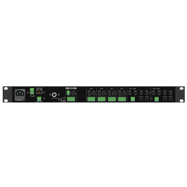Pre-Mixer stereo 6 canali con Mediaplayer e telecomando Tuner FM, Lettore/Registratore MP3 su USB/SD card, Bluetooth 2.1 Ingressi: 2xMic bilanciati con Phantom e Talkover assegnabili