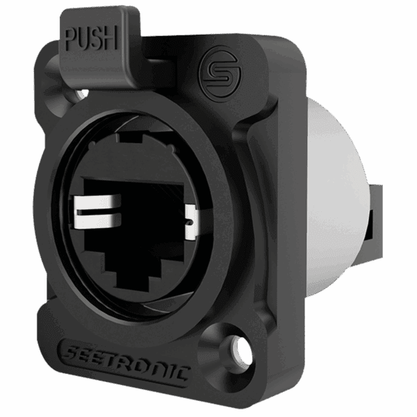 Il Seetronic SE8FDYH-62-B-NS è un jack di montaggio RJ45 con connettore di installazione. È classificato IP65 quando è accoppiato o con il cappuccio di tenuta montato. Il connettore del telaio ha un sistema di bloccaggio a scatto, si adatta ai fori di dimensione D e si installa dalla parte anteriore. Sul retro è presente un connettore IDC a 8 pin. È adatto per velocità di rete fino a CAT5e (1 Gigabit) ed è conforme alla Classe D secondo TIA / EIA 568B e ISO / IEC 11801.