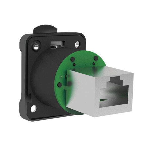 Questo connettore per telaio RJ45 si adatta a fori di misura D e viene installato dalla parte anteriore o posteriore. Sul retro, questo connettore passacavo è dotato di una presa RJ45 che accetta connettori RJ45. È adatto per velocità di rete supportate fino a CAT5e (1 Gigabit) e dispone di un sistema di chiusura a scatto sulla parte anteriore. Presenta una scocca in metallo pressofuso con zinco e utilizza contatti placcati oro.