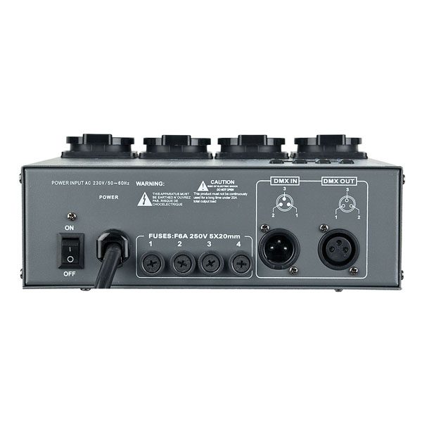 Il dispositivo Showtec RP-405 è uno relé-pack con relé integrati particolarmente adatto per gli effetti luce LED. Dato che i normali relé-pack non sono adatti per eseguire lo switch sulla bassa potenza dei LED, questo RP-405 è la soluzione giusta.