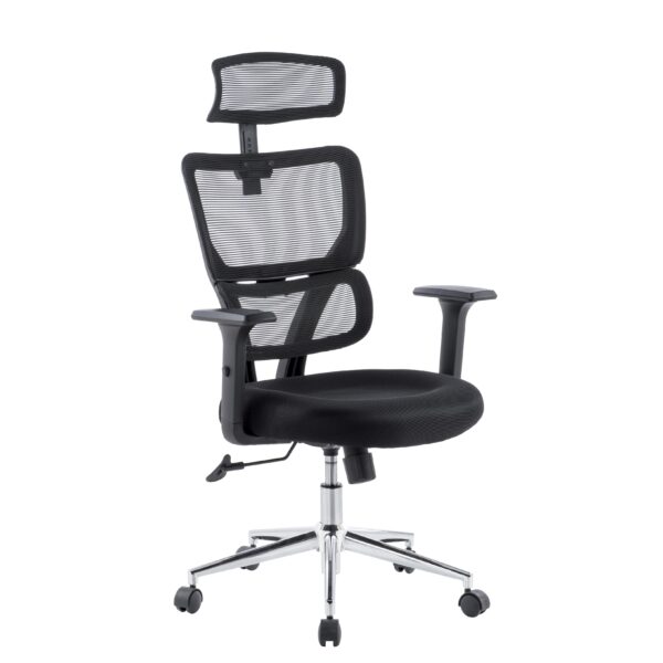 • Elegante sedia per ufficio con schienale alto e comodo poggiatesta• Schienale e poggiatesta sono regolabili in altezza• Schienale ergonomico a due sezioni• Supporto lombare regolabile • Telaio posteriore nero• Base cromata• Meccanismo di blocco a una posizione• Braccioli 3D• Colore: neroCaratteristiche• Con braccioli 3D• Seduta in tessuto di colore nero• Regolazione pneumatica dell’altezza• Regolazione della posizione del poggiatesta• Schienale ergonomico a due sezioni• Base cromata con ruote piroettanti in PU• Supporto lombare regolabile• Realizzazione in maglia a due stratiDimensioni• Larghezza: 67,5 cm• Profondità: 69,5 cm• Altezza regolabile: 109 – 117,5 cm