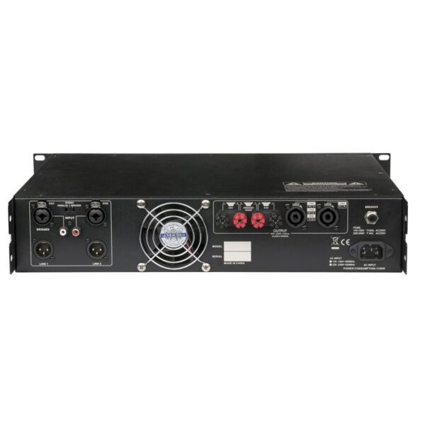 I LED Signal, Clip, Fault e Power indicano lo stato dell’amplificatore. Il livello di uscita può essere regolato per ciascun canale utilizzando i controlli di volume. Il guadagno può essere impostato sul pannello posteriore per un ingresso di 0,775 V o un guadagno di 32 dB, e un interruttore di modalità seleziona le modalità stereo, mono e bridge.