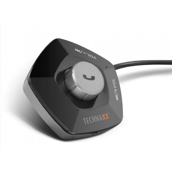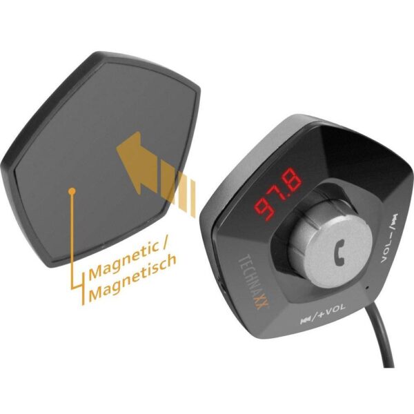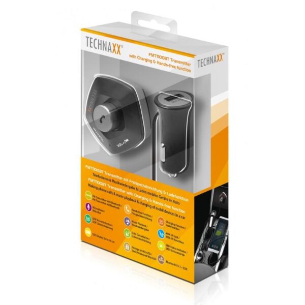 • Guida sicura durante le chiamate telefoniche tramite il sistema vivavoce Bluetooth• Maneggevolezza con 2 pulsanti• Bluetooth V2.1 + EDR con portata di trasmissione di ~ 10m• Supporta schede MicroSD fino a 32 GB• Supporta AUX-IN• Riduzione del rumore DSP e cancellazione dell’eco per una qualità della voce cristallina• Volume regolabile dell’altoparlante• Indicatore di stato a LED indica modalità di lavoro, frequenza, volume, ecc.• Semplice fissaggio dell’unità FM con superficie adesiva 3MSpecifiche tecniche• Protocollo Bluetooth: AVRCP V1.5, HFP V1.5, A2DP V1.3• Alimentazione: DC 12-24V (presa accendisigari di un veicolo)• Dimensioni del display a LED (L) 2,0 x (W) 0,8 cm• Campo di frequenza FM 87,5-108,0 MHz, max. 5m• Risposta in frequenza 20Hz-15KHz• Formato musicale MP3, WMA, WAV, FLAC• Porta USB per ricarica 5 V / 2.1 A max.Dimensioni• Ø 5,7 cm• Spessore: 2,8 cm • Lunghezza cavo unità FM per caricabatterie: 84 cmContenuto della confezione• Trasmettitore FMT1100BT con funzione vivavoce e ricarica• Cavo AUX-IN• Manuale utente