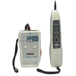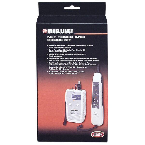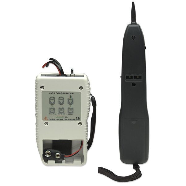• Testa le comunicazioni dati, le telecomunicazioni, le reti audio e video• Interruttore a due posizioni per segnale singolo o multitono• LED per polarità, continuità e voltaggio• La modalità avanzata della batteria di conversazione fornisce corrente per le conversazioni vocali su coppie inattive• Cavi di prova e cavi modulari per diverse verifiche sul cavo singolo o sui connettori modulari• Punta in plastica sostituibile per prevenire accidentali corti circuiti• Rintraccia o identifica fili o cavi in un groviglio o all’interno di un gruppo• Morsetti tipo coccodrillo, connettore tipo RJ45, RJ12, opzionali tipo FGeneratore• Frequenza: High alternating 500-781 Hz ; Low alternating 446-657 Hz• Batteria di conversazione: 9V fino a 600 ohms circuit• Protezione del voltaggio: 50 VDC o 24 VAC• Batteria: 9V DC standard o alcalina• Approvazione CE: EN 55022 Class B per ITE e EN 55024• Dimensioni: 125 x 68 x 26 mm • Peso: 120gSonda• Gain: 30 db• Resistenza della punta: 30 ohms (punta in plastica)• Batteria: 9V DC standard o alcalina• Approvazione CE: EN 55022 Class B per ITE e EN 55024• Dimensioni: 210 x 40 x 28 mm • Peso: 140g Informazioni ambientali• Temperatura d’esercizio: 0 – 40°C Contenuto della confezione• Sonda• Generatore con morsetti tipo coccodrillo e connettore RJ-12• Connettore tipo F femmina a adattatore RJ-45 • Custodia• Manuale d’istruzione