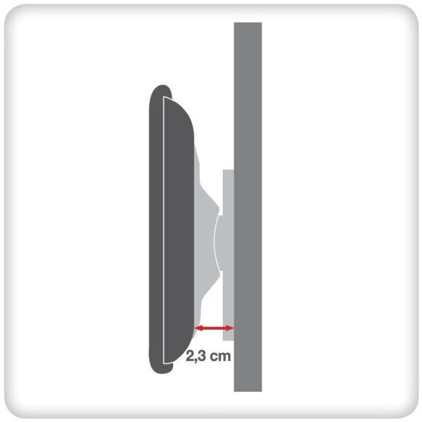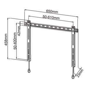 • Staffa dal design sottile, consente una distanza di soli 23 mm dal muro, il miglior profilo sia per l’installazione che per il risultato gradevole• Installazione veloce grazie ad un sistema intelligente di bloccaggio e al supporto pieghevole che facilita il collegamento dei cavi• Le staffette ad angolo presenti sull’estremità della barra Vesa consentono pieno accesso al pannello posteriore del monitor per le operazioni di manutenzione• Il sistema integrato di regolazione del livello consente di regolare la posizione del televisore anche se la piastra a muro è stata installata leggermente fuori livelloCaratteristiche• Staffa slim universale per TV sottili 40-65’• Supporta VESA fino a 600×400 mm • Massimo peso supportato: 60 kg• Dotata di bolla di livelloSpecifiche• Distanza dal muro: 23 mm• Larghezza: 650 mm• Con bolla di livello• Colore: neroContenuto della confezione• Supporto TV da muro• Materiale di montaggio• Manuale d’istruzioni