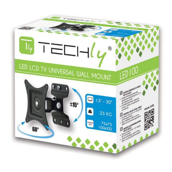 • Staffa universale per fissare una TV LED /LCD al muro; facile e veloce da installare, è ideale per la casa, l’ufficio e le applicazioni commercialiCaratteristiche• Staffa adatta per TV LED LCD 13-30’• Supporta VESA 75×75 e 100×100 mm • Massimo peso supportato: 23 kgSpecifiche• Inclinazione +/-15°• Orientamento orizzontale: 60°• TV rotabile di 360°• Distanza dal muro 98 mm• Dimensioni: 80 x 109 x 98 mm, 0.9kg• Colore: neroLa confezione include• Supporto a muro per TV LED LCD• Accessori di fissaggio (viti, tasselli…) e istruzioni per l’installazione