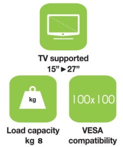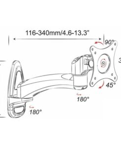 • Staffa universale per fissare una TV LED / LCD al muro; facile e veloce da installare, è ideale per la casa, l’ufficio e le applicazioni commerciali• Supporto a muro Full-motion con braccio singolo• La struttura in alluminio fornisce robustezza mantenendo uno stile elegante e moderno• Regolazioni dell’inclinazione e della rotazione facili da effettuare per uno stile di vita ergonomico• Installazione semplice e veloceCaratteristiche• Staffa adatta per TV LED LCD 15-27’• Staffa universale, supporta standard VESA 75×75 e 100×100• Massimo peso supportato: 8 kg• Braccio a 2 snodi con massima estensione di 340 mmSpecifiche• Inclinazione: -90/+45°• Orientamento orizzontale: 180°• Distanza minima dal muro: 116 mm• Distanza massima dal muro: 340 mm• Dimensioni: 167 x (116-340) mm• Colore: bianco / neroLa confezione include• Supporto a muro per TV LED LCD• Accessori di fissaggio (viti, tasselli…)• Manuale d’installazione