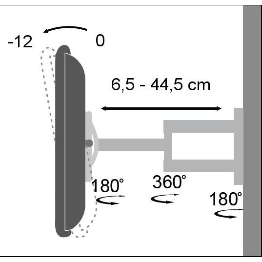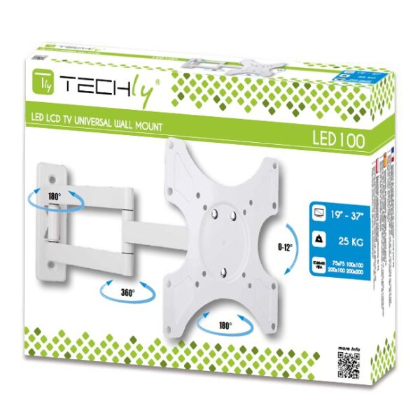 • Staffa universale per fissare una TV LED /LCD oppure un monitor al muro; facile e veloce da installare, è ideale per la casa, l’ufficio e le applicazioni commercialiCaratteristiche• Staffa adatta per TV LED LCD 19-37’• Supporta VESA 75×75, 100×100, 200×100, 200×200 mm • Massimo peso supportato: 25 kg• Braccio a 3 snodi con massima estensione di 445 mmSpecifiche• Inclinazione da 0 a -12°• Orientamento orizzontale: 180°• Distanza minima dal muro: 65 mm • Distanza massima dal muro: 445 mm• Dimensioni: 190 x 57 mm placca a muro; 65 – 445 mm braccio, 2.2kg• Colore: biancoLa confezione include• Supporto a muro per TV LED LCD• Accessori di fissaggio (viti, tasselli…) e istruzioni per l’installazione