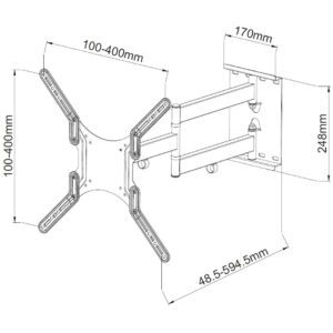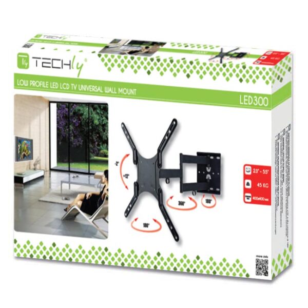 • Staffa dal design compatto, ideale per TV sottili• Robusta piastra di fissaggio e nuovo sistema di inclinazione che permette una regolazione dell’angolo di -2° a +12°• Una regolazione laterale di +/-2° assicura la messa a livello anche dopo aver appeso la TVCaratteristiche• Staffa universale per TV sottili 23-55’• Supporta VESA da 100×100 a 400×400 mm • Massimo peso supportato: 45 kg• Con possibilità di fissaggio ad angoloSpecifiche• Inclinazione da -2° a +12°• Orientamento orizzontale: 180°• Distanza minima dal muro: 48 mm• Distanza massima dal muro: 590 mm• Dimensioni: 170 x 248 x (48-590) mm• Con gestione dei cavi • Colore: neroContenuto della confezione• Supporto TV da muro• Materiale di montaggio• Manuale d’istruzioni