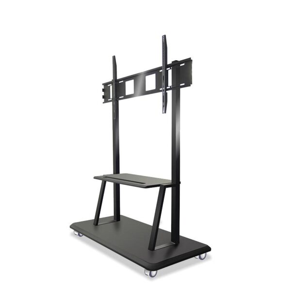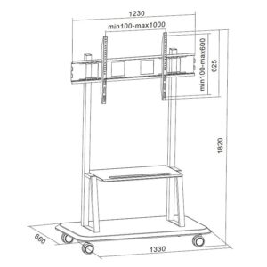 • Supporto mobile da pavimento multifunzione• Supporto per TV LED/LCD da 50′ a 120′ • Supporta VESA da 100×100 minimo a 800×600 massimo• Massimo peso TV supportato: 150 kg• Offre una mensola A/V per l’appoggio di attrezzature o altro materiale (dimensioni: 637 x 263 mm)• Altezza della TV regolabile in 2 posizioni• Due ruote provviste di freno offrono maggiore stabilità• Dimensioni della base: 1330 (L) x 660 (P) mm• Altezza totale: 1820 mm• Colore trolley: nero Contenuto della confezione• Staffa di supporto per la TV• 2 colonne• Base• 4 ruote• Ripiano per apparecchiature A/V• Materiale per l’installazione• Manuale d’istruzioni