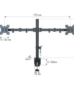 • Doppio supporto da scrivania ideale per sostenere due monitor, incrementando lo spazio operativo e riducendo il disordine; ottimizza l’ergonomia permettendo di regolare l’inclinazione, l’altezza, la rotazione per individuare la migliore posizione di visibilità degli schermi• Facilmente installabile, è l’ideale per la casa, l’ufficio e per altre particolari applicazioni• Installazione tramite morsetto a ‘C’ o tramite vite passanteCaratteristiche• Staffa da scrivania per 2 monitor 13-27′ affiancati• Supporta VESA 75×75 e 100×100 mm • Con sistema di sgancio rapido della placca VESA• Massimo peso supportato: 20 kg (10 kg per ciascun attacco VESA)• Tubo di supporto alto 450 mm• Altezza regolabile e resistente morsetto per fissare il supporto alla scrivania in modo stabile• Sistema integrato di gestione cavi• Completamente regolabile, il monitor può essere inclinato, ruotato, girato per il massimo della flessibilità di visione• Colore: neroDimensioni• Larghezza base: 93 mm• Profondità base: 93 mm• Altezza max tubo regolabile: 450 mmContenuto della confezione• Supporto da scrivania per due monitor• Materiale di fissaggio• Istruzioni per l’installazione