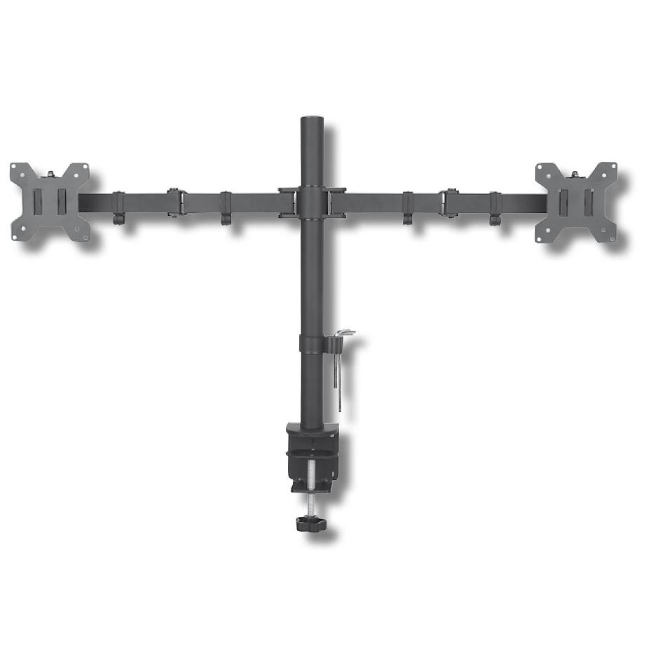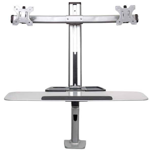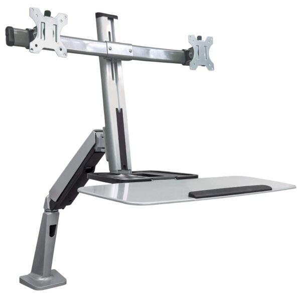 • Supporto da scrivania per workstation doppio monitor con mensola di supporto per tastiera: rappresenta una vera e propria postazione di lavoro ergonomica per lavorare in piedi/seduti • Supporta due monitor LED/LCD 13′-27’• Placca VESA staccabile per facilitare l’installazione• Meccanismo di regolazione full-motion, permette di ruotare, inclinare verticalmente e orizzontalmente lo schermo per una visualizzazione ottimale• Sistema di molla a gas con meccanismo di controbilanciamento, permette di creare una regolazione sicura e stabile per una perfetta visualizzazione• Pistone a gas regolabile, si adatta a diversi pesi del monitor• Con sistema di gestione dei cavi incorporato• Vassoio porta tastiera pieghevole• Vassoio secondario di appoggio per altri oggetti da tavolo• Installazione alla scrivania morsetto o vite passanteGenerale• Supporto indicato per monitor sia piatti e che curvi da 13′ fino a 27’• Materiale: alluminio, acciaio, plastica• Carico nominale: Totale, 8 kg; Display e tastiera, 1 kg.• Supporto VESA: 75 x 75 e 100 x 100• Inclinazione: ± 15 °• Rotazione del monitor: ± 90 °• Rotazione del braccio: ± 180 °• Estensione del braccio: fino a 442 mm Dimensioni del prodotto• 1150 (L) x 760 (P) x 1020 (A) [mm]Contenuto della confezione• Supporto universale per workstation con due monitor• Base e morsetto per il fissaggio alla scrivania • Ferramenta per installazione e istruzioni
