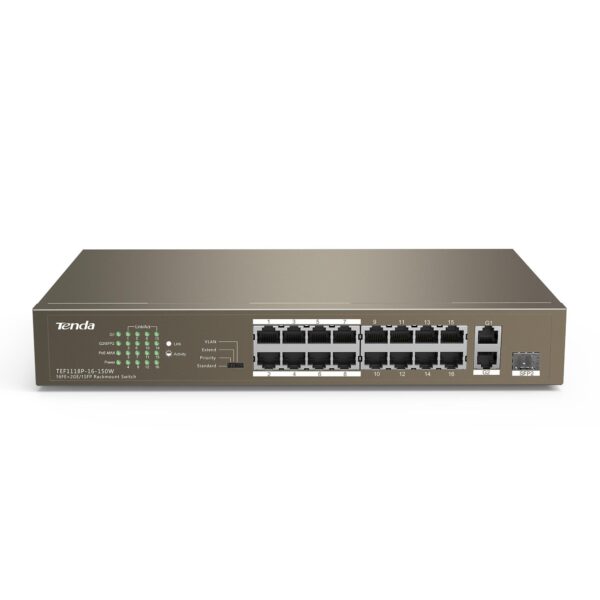 ICIP-F1118P-16 è uno switch PoE dotato di 16 porte RJ45 10/100 Mbps Base-TX, 1 porta RJ45 10/100/1000 Mbps Base-T e 1 porta SFP 1000 Mbps Base-X. Le porte da 1 a 16 rispettano lo standard IEEE 802.3af (max potenza PoE: 15.4 W) e lo standard 802.3at (max potenza PoE: 30 W). Lo switch offre la massima potenza PoE di 135 W e può fornire energia e scambiare dati con APs, telecamere IP e telefoni IP attraverso cavi di rete.