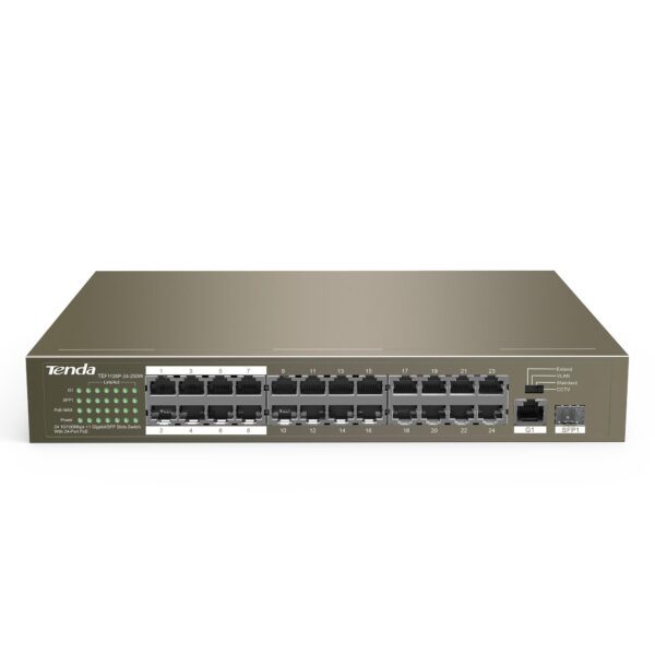 ICIP-F1126P-24 è uno switch PoE dotato di 24 porte RJ45 10/100 Mbps Base-TX, 1 porta RJ45 10/100/1000 Mbps Base-T e 1 porta SFP 1000 Mbps Base-X. Le porte da 1 a 16 rispettano lo standard IEEE 802.3af (max potenza PoE: 15.4 W) e lo standard 802.3at (max potenza PoE: 30 W). Lo switch offre la massima potenza PoE di 225 W e può fornire energia e scambiare dati con APs, telecamere IP e telefoni IP attraverso cavi di rete.