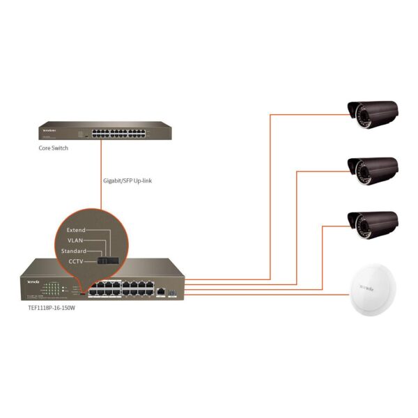 I-SWHUB TEF1118P è uno switch PoE dotato di 16 porte RJ45 10/100 Mbps Base-TX, 1 porta RJ45 10/100/1000 Mbps Base-T e 1 porta SFP 1000 Mbps Base-X. Le porte da 1 a 16 rispettano lo standard IEEE 802.3af (max potenza PoE: 15.4 W) e lo standard 802.3at (max potenza PoE: 30 W). Lo switch offre la massima potenza PoE di 135 W e può fornire energia e scambiare dati con APs, telecamere IP e telefoni IP attraverso cavi CAT5. Fornisce anche semplici modalità di gestione come CCTV, VLAN, e Extend per ridurre i costi di cablaggio dei terminali IP come gli AP e le telecamere IP. Nei progetti reali, spesso AP e telecamere sono installate all’esterno e in posizioni elevate e questo aumenta anche la possibilità che vengano colpiti da un fulmine. Il risultato è che l’attrezzatura viene danneggiata o porta alla paralisi dell’intera rete locale. Lo switch I-SWHUB TEF1118P ha una protezione parafulmine professionale e previene i fulmini all’alimentazione; con due livelli di protezione limita la potenza dei fulmini dal cavo che equivale a dare all’intero sistema di monitoraggio della rete una barriera di sicurezza.Lo standard di test è molto più alto rispetto alla richiesta CE nazionale. In caso di temporali, può anche fornire una rete di monitoraggio stabile e affidabile e garantire la trasmissione delle immagini.• Switch con 16 porte PoE 10/100Mbps + 1 slot Gigabit/SFP• Standard e Protocolli: IEEE 802.3, IEEE 802.3u,IEEE 802.3, IEEE 802.3af• MTBF: più di 100,000 ore• Indicatori: – 16 x Link/Act per dispositivo- 1 x G1 Link/Act per dispositivo – 1 x SFP Link/Act per dispositivo – 1 x PoE-MAX per dispositivo – 1 x Power per dispositivo• Interfaccia:- 16 porte 10/100Base-TX (Dati/Energia) – 1 porta 10/100/1000 Base-T (Dati) – 1 porta 1000 Base-X SFP• Protezione dai fulmini: 6KV• Store & Forward: Si• Capacità di scambio: 7.2 Gbit/s• Velocità di inoltro pacchetto dati: 5.36Mpps• Dimensioni tabella MAC: 4K• Gestione fornitura PoE: le porte da 1 a 16 supportano lo standard IEEE802.3at/af POE • PN pass-through: 1 2 4 5 +,3 6 7 8 -Alimentazione• Potenza in ingresso: AC:100-240V~ 50/60Hz• Consumo di energia in configurazione completa: