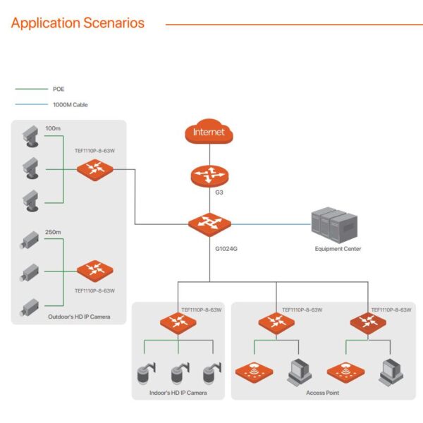 In primo piano con modalità estesa, funzioni VLAN a una chiave e QoS, TEF1110P-8-63W è la scelta ideale per PMI, supermercati e ristoranti con videosorveglianza di piccole dimensioni.