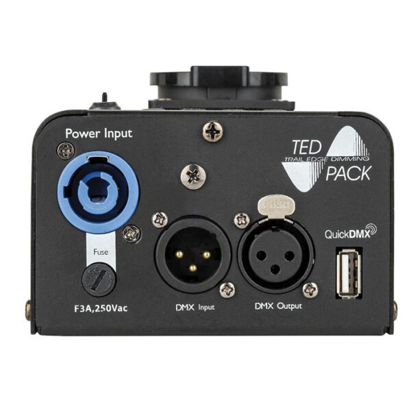 Il TED Pack Single CEE 7/5 utilizza MOSFET per attenuare l’uscita e può essere commutato tra dimmerazione leading edge e trailing edge. La modalità FX offre un canale di sicurezza che impedisce l’attivazione involontaria e può essere utile per il controllo di lanciacoriandoli, tubi, drop, ecc. L’unità può essere controllata sia manualmente che in DMX. I fori di montaggio sul retro e sulla parte superiore permettono la connessione di un gancio.