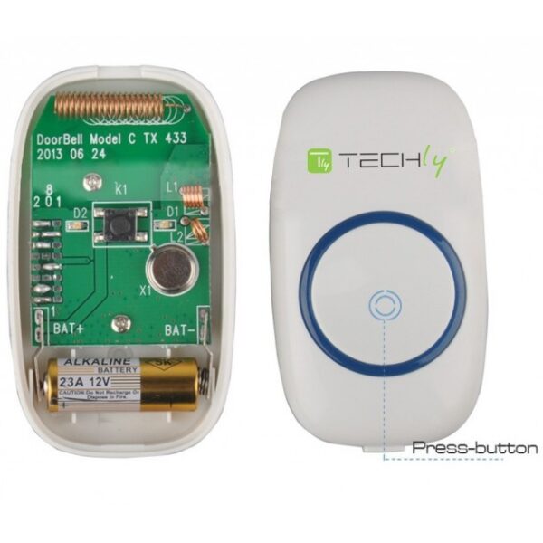 Telecomando supplementare per campanelli wireless Techly.Semplice e veloce da installare: basta posizionare il campanello dove si desidera e il telecomando su una parete esterna qualunque. A questo punto basterà premere il pulsante sul telecomando per mettere in funzione il campanello che immediatamente suonerà.Caratteristiche tecniche• Trasmettitore alimentato a batteria• Include batteria alcalina 23A 12V• Uscita: < 10 mw• Voltaggio: < 12V• Compatibile con modelli I-BELL-RING01(ver. 2) I-BELL-RING02 e I-BELL-RING03Dimensioni• Larghezza: 40 mm• Profondità: 15 mm• Altezza: 70 mmCertificazioni• CE• RoHS• RAEEContenuto della confezione• Radiocomando trasmettitore wireless per campanello• Viti e biadesivo per fissaggio a muro