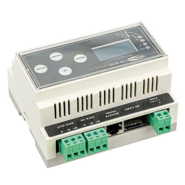 Ci sono 6 pin GPIO disponibili per avviare o fermare i vostri show tramite trigger esterni come interruttori o sensori di rilevamento del movimento. Anche un pannello remoto dedicato a parete può essere facilmente collegato con un normale cavo cat-5. Il TR-512 montato su guida DIN è il prodotto giusto per attivare i vostri spettacoli in parchi a tema, musei, negozi o altri progetti di integrazione di sistema.
