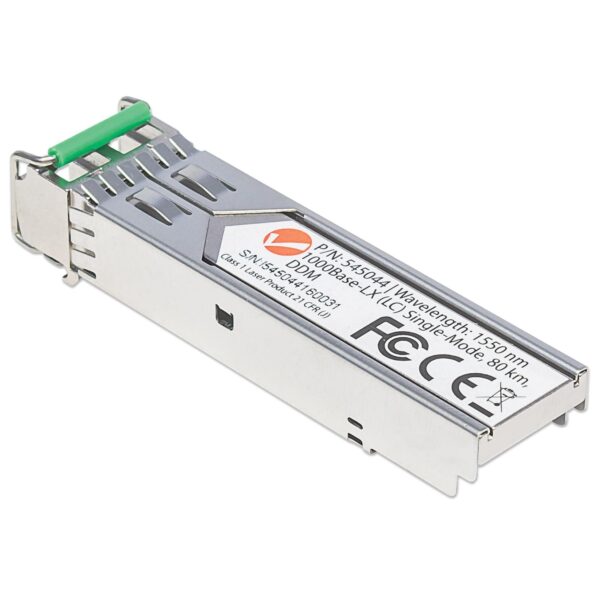 • Velocità di trasferimento dati: 1000 Mbps• Una porta in fibra monomodale LC duplex 1000Base-ZX• Distanza supportata: fino a 80 km (cavo 9/125 µm)• Conforme alle specifiche SFP Transceiver MSA• Lunghezza d’onda: 1550 nm• Formato SFP standard• Supporta hot-pluggingStandard• IEEE 802.3z (Fibra ottica Gigabit)Informazioni generali• Supporta: 1000Base-ZX fibra monomodale 9/125 µm • Connettore: porta fibra duplex LC, 1000Base-ZX• Distanza: 80 km • Lunghezza d’onda: 1550 nm• Potenza fibra ottica – Massima potenza di trasmissione: 9 dB – Minima potenza di trasmissione: 15 dB – Sensitività: -28 dB – Power budget: 43 dB• Design: SFP (small form factor pluggable), 1.25 GbpsAlimentazione• Alimentazione richiesta: 3.3 V• Consumo: 1.0 Watt (massimo)Dati fisici• Dimensioni: 55 (L) x 13 (W) x 12 (H) mm• Peso: 15 g• Temperatura d’esercizio: 0 – 70°C (32 – 158°F)• Umidità d’esercizio: 10 – 85% RH, senza condensa• Temperatura di stoccaggio: -40 – 85°C (-40 – 185°F)Certificazioni• CE• FCC Classe A• RoHSContenuto della confezione• Gigabit Ethernet SFP Mini-GBIC Transceiver