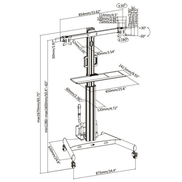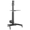 • Supporto multifunzione per due TV LED/LCD da 13-32′ • Standard VESA supportati dal carrello: 75×75; 100×100• Massimo peso supportato dalla staffa: 8 kg cad.• Massimo peso supportato dalla mensola: 2 kg• Staffa TV regolabile in altezza e inclinazione (+/-30°) per una perfetta altezza di visualizzazione• Rotazione 360°• Provvisto di mensola porta CPU; Peso massimo supportato 5 kg• Rotelle per carichi pesanti con rinforzo di progettazione per sostenere il peso delle attrezzature e fornire una rapida manovrabilità• Gestione interna dei cavi Contenuto della confezione• Carrello per 2 TV con mensola e porta CPU• Kit di fissaggio e istruzioni per l’installazione