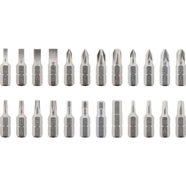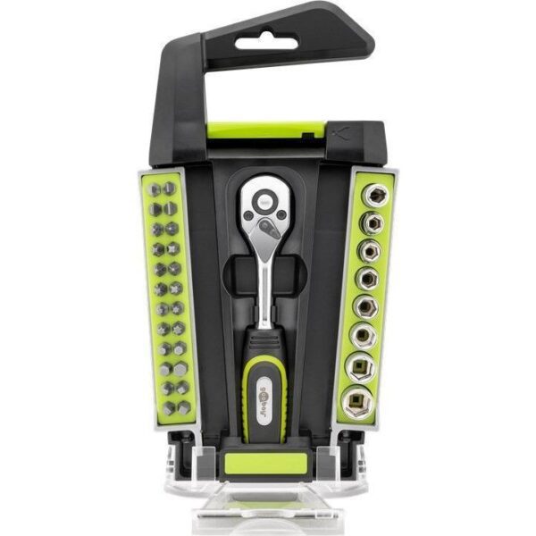 Valigetta 33 cacciaviti a cricchetto contenente:• 4x teste piatte: 3 mm, 4 mm, 5 mm, 6 mm • 4x punte Phillips: PH0, PH1, PH2, PH3 • 4x Pozidriv: PZ0, PZ1, PZ2, PZ3 • 4x Torx: T10, T15, T20, T25 • 4x teste esagonali: H3, H4, H5, H6 • 4x punte quadrate: S1, S2, S3, S4 • 1x porta punte• 1x dado 1/4 di pollice • 7x dadi esagonali: 5,5 mm, 6 mm, 7 mm, 8 mm, 9 mm, 10 mm, 11 mm• Realizzato in acciaio al cromo vanadio (CrV) con maggiore resistenza alla deformazione• L’anello di commutazione (a destra, fisso, a sinistra) consente di risparmiare molto tempo durante il fissaggio• Punte stabili garantiscono trasmissione della coppia affidabile e fissaggio rapido• Manico ergonomico fornisce una presa comoda e ferma durante il lavoro• La scatola pieghevole facilita il cambio di punte• Impugnatura antiscivolo gommata