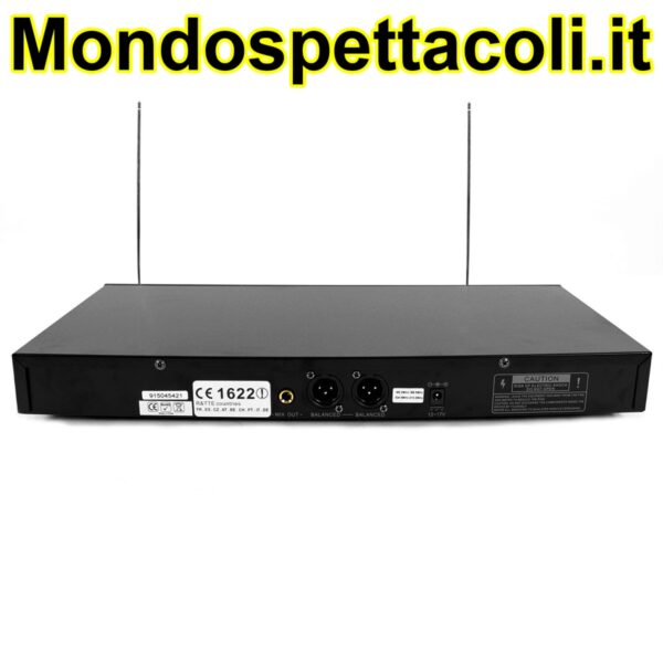 – Alimentazione DC 15V17V per il ricevitore, alimentazione tramite 2 batterie da 1,5V per il microfono a mano
