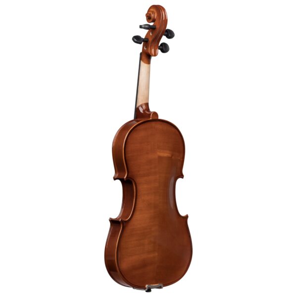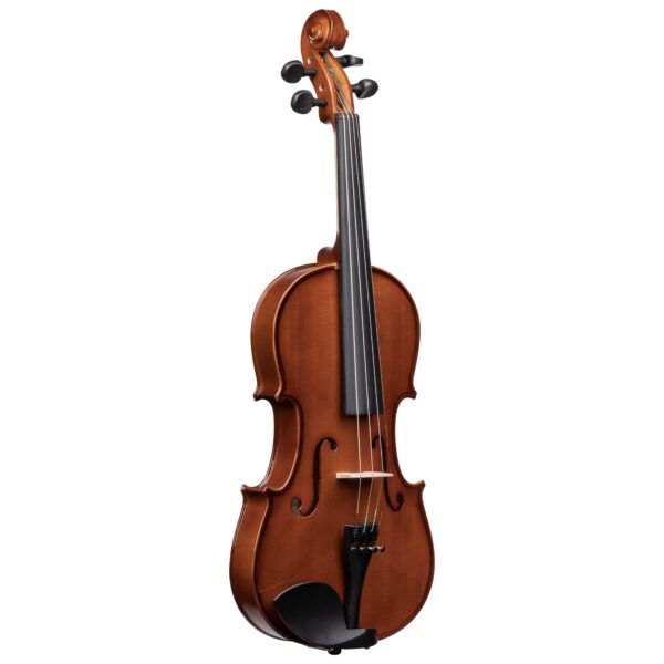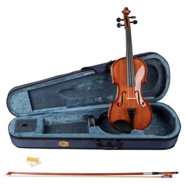 | violino 1/2, tavola armonica in abete massello, fondo e fasce in acero massello, tastiera e piroli ebanizzati, cordiera in metallo con 4 tiracantini. Custodia triangolare Blu. Con archetto e colofonia. |
